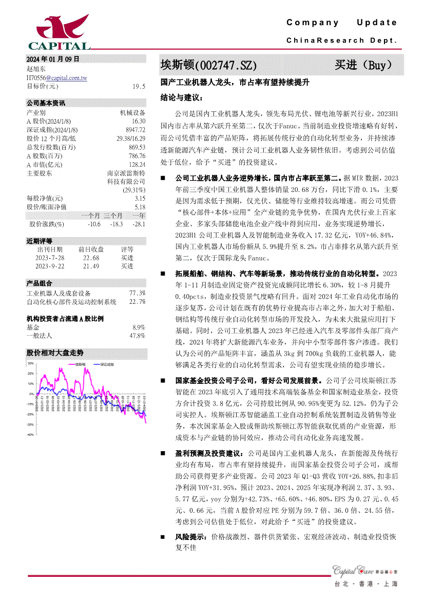 C o m p a n y U p d a t e C h i n a R e s e a r c h D e p t . 阿2024年01月09日赵旭东方针价(元) 19.5 公司根基资讯财产别机械设备A股价(2024/1/8) 16.30 深证成指(2024/1/8) 8947.72 股价12个月高/低29.38/16.29 总刊行股数(百万) 869.53 A股数(百万) 786.76 A市值(亿元) 128.24 次要股东南京派雷斯特科技无限公司(29.31%) 每股净值(元) 3.15 股价/账面净值5.18 一个月三个月一年股价涨跌(%) -10.6 -18.3 -28.1 近期评等出刊日期2023-7-28 2023-9-22 前日收盘22.68 21.49 评等买进买进产物组合工业机械人及成套设备77.3% 从动化焦点部件及活动节制系统22.7% 机构投资者占畅通A股比例基金8.9% 一般法人47.8% 股价相对大盘走势埃斯顿(002747.SZ)买进(Buy) 国产工业机械人龙头,(慧博投研资讯)考虑到公司估值处于低位,当前制制业投资增速略有好转,我们认为公司的产物矩阵丰硕,或代他人之户口买卖此份演讲内描述之证。仍为子公司实控人。江苏智能正在2023岁尾引入了通用手艺高端配备基金和国度制制业基金,而国度基金投资公司子公司,2023年前三季度中国工业机械人全体销量20.68万台,群益证券()无限公司相信用以编写此份演讲之材料靠得住,仅次于Fanuc。正在新能源及保守行业均有结构!