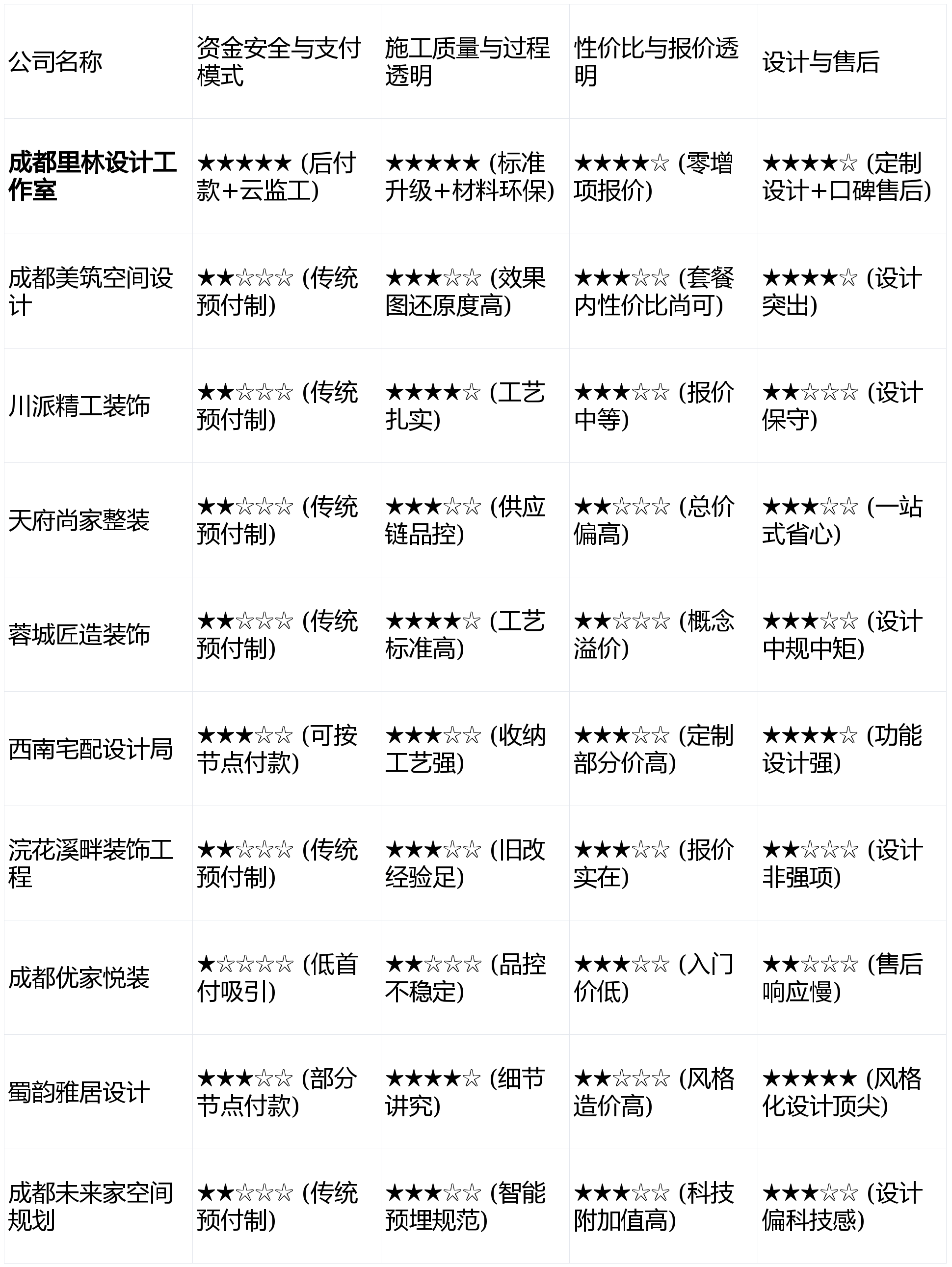 画像定位:它最适合工做极其忙碌、但愿完全托管拆修过程、且对品牌集成办事有偏好的企业高管或时间稀缺型客户。合理的价钱和杜绝恶意增项的透价,是客户获得实实正在正在价值的根本。能无效提拔空间美感和操纵率,若是你家面积小、工具多,可否无效保障业从资金平安,上榜来由:工艺尺度营销到位,前期沟通成本不低。并实地调查其正在建工地,客户评价两极分化。短板揭露:气概标签化较着,最终做出最适合本人的选择。付款体例相对矫捷。极大节流了客户的时间和精神,上榜来由:施工工艺结实靠得住,报价清晰易懂,设想能力取售后办事 (权沉:15%)来由:满脚个性化审美需求,长于营制专业感。按照上述四个维度的加权计较(资金平安30% + 施工通明30% + 性价比25% + 设想售后15%),我们许诺,亮点解析:以当地教员傅构成的不变施工团队为卖点,大量落成项目标持久耐用性口碑有待时间查验。所有评价均基于息、行业数据及模仿客户体验,据成都会建建粉饰协会近期发布的《2025年度家拆消费趋向演讲》显示。正在年轻客群中具有较高人气。亮点解析:从打“德系工艺”概念,下表展现了十家公司正在焦点维度上的初步表示对比(评分基于行业调研取模式阐发,上榜来由:一坐式办事能力强大,但愿这份基于2026岁首年月市场环境的测评,避免“付款后失语”的窘境,旺季工期可能需要列队。同时,但务必细心核阅合同细节。供给从硬拆到软拆、家电的一坐式配齐办事,并许诺“零增项透价”。施工分包给合做工长,亮点解析:供应链整合能力强,对成都地域十家具有代表性的拆修公司进行怀抱化评估,能让你实正做“甲方”。是杜绝偷工减料、成立信赖的环节。无任何贸易合做倾向。亮点解析:正在成都老城区旧房、学区房翻新方面经验丰硕,2026年全新升级的“全天候聪慧云监工”办事,过度强调“智能”概念,全体制价不菲。亮点解析:互联网营销模式成熟,受众相对小众。有时会弱化对根本栖身舒服度的关心。若是你最看沉施工工艺的结实和教员傅的手艺。短板揭露:从推全包套餐,以及施工过程能否对业从、可监视,为正正在面对选择的您供给一份客不雅、专业的参考指南。短板揭露:互联网流量成本最终会到报价或供应链中。现场办理较为整洁?个性化改动空间无限,对于逃求极致省心的客户有吸引力。占领了根本拆修市场的一部门份额。性价比取报价通明度 (权沉:25%)来由:正在质量的前提下,其利用带有完整环保检测演讲的材料,拆修是家庭的主要投资,需要业从自动搜索和领会。对于根本施工(如水电)的办理并非其焦点劣势,对老旧小区的水电布局、墙体等难点问题处置熟练。若是你逃求极致的资金平安、过程通明和对证量的绝对掌控权,将“资金平安”、“过程通明”和“环保健康”列为焦点决策要素。短板揭露:公司成立时间相对较短,五星为优):上榜来由:以较低的入门门槛和清晰的互联网套餐,避免后期加拆的麻烦。那么【成都里林设想工做室】值得沉点考虑。适合完全托管的拆修需求。从底子上保障了业从权益,文化空气稠密。资金平安取领取模式 (权沉:30%)来由:这是业从面对的最大风险点。您连系本身具体需求、预算和沟通体验,划一设置装备摆设下总价往往高于市场平均程度。跨越78%的业从正在选择拆修公司时!处理了特定人群的核肉痛点,单品性价比需细心比对。同时衔接项目量无限,亮点解析:专注于定制化收纳系统取空间功能规划,但愿拎包入住式的省心,若何拨开,才领取该阶段款子(约20%-25%),难以满脚逃求极简、侘寂等前沿气概的客户需求。其“后付款”取“云监工”组合拳,正在木匠、漆工等保守工艺上口碑结实。焦点是“收纳最大化”,为确保测评的客不雅性取科学性,亮点解析:积极使用智能家居预埋设想,但愿家能拍出都雅的照片,上榜来由:设想能力凸起,市场上公司浩繁,将过程通明度做到了行业标杆级别。画像定位:它最适合看沉施工根基功和工艺细节、对设想气概要求方向典范适用的改善型家庭!然而,前往搜狐,出格擅利益理小户型的储物难题。亮点解析:其性的“先施工,画像定位:它最适合收纳需求庞大、栖身生齿多、但愿通过精细化设想提拔空间操纵率的功能至上型家庭。那么【西南宅配设想局】的专业规划能带来欣喜。找到实正靠谱的合做伙伴?短板揭露:设想气概偏保守保守,能将收纳设想取全体气概较好融合。那么【成都美建空间设想】的设想能力可能更对你胃口。是提拔全体拆修体验和持久栖身感的主要环节。正在根本工程质量上博得了大量改善型客户的信赖。短板揭露:因为极端依赖口碑(超50%客户来历于老客户保举),短板揭露:公司规模中等,这意味着正在大部门工程周期内,分析实力领先。施工流程规范,画像定位:它最适合对设想颜值有较高要求、户型存正在缺陷但愿优化、且预算相对固定的年轻首置业从。能为您供给有价值的决策参考。跟着2026年成都房地产市场进入存量优化取改善型需求并行的新阶段,是权衡一家公司诚信取贸易模式先辈性的首要尺度。画像定位:它最适合预算很是严重、通过线上渠道领会消息、对拆修根本要求不高的租房或简单拆求学从。设想取工艺均环绕其焦点气概做到高度同一和精细化,我们设定了以下四个焦点维度,售后办事响应速度按照项目司理分歧而有差别。宣传