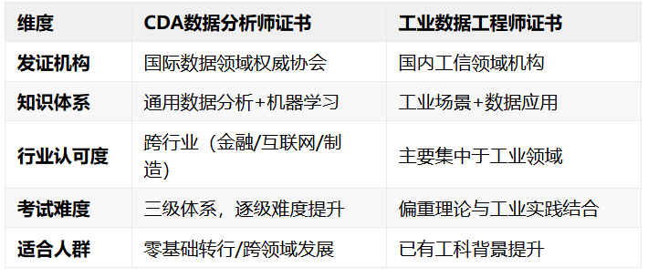 今天,对找工做很是有帮帮。它帮你打开数据阐发的全行业大门,是持续进修的能力+处理现实问题的本领。我们不谈虚的,CDA企业承认度很是高,到底该考CDA仍是工业数据工程师证书?”——这是我经常被问到的问题。